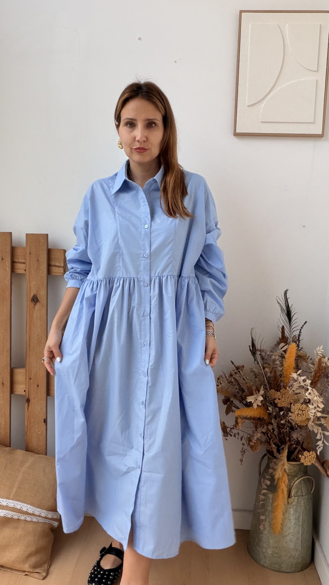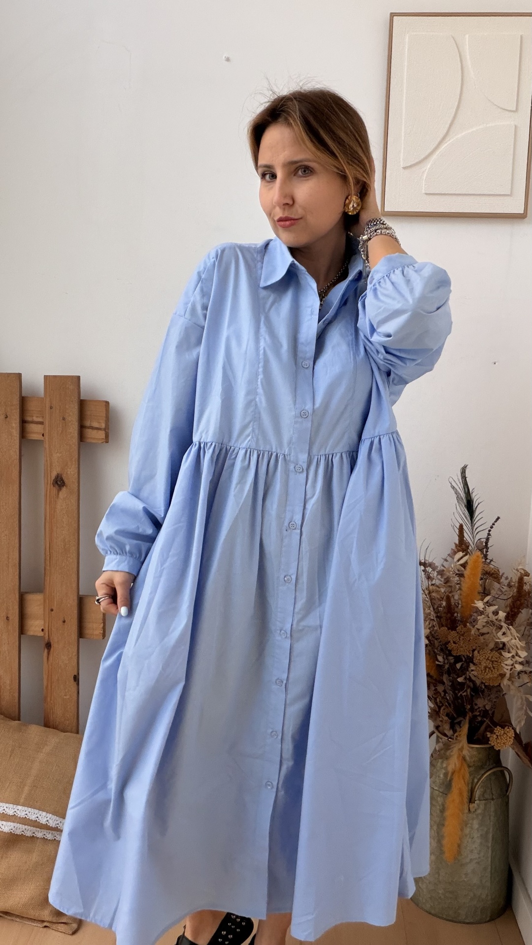 Até 3XL. Solto, com bolsos, botões a todo o comprimento.