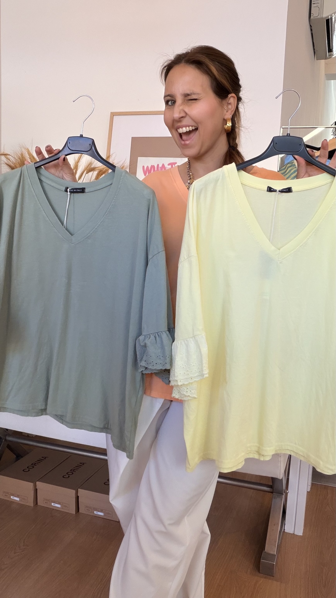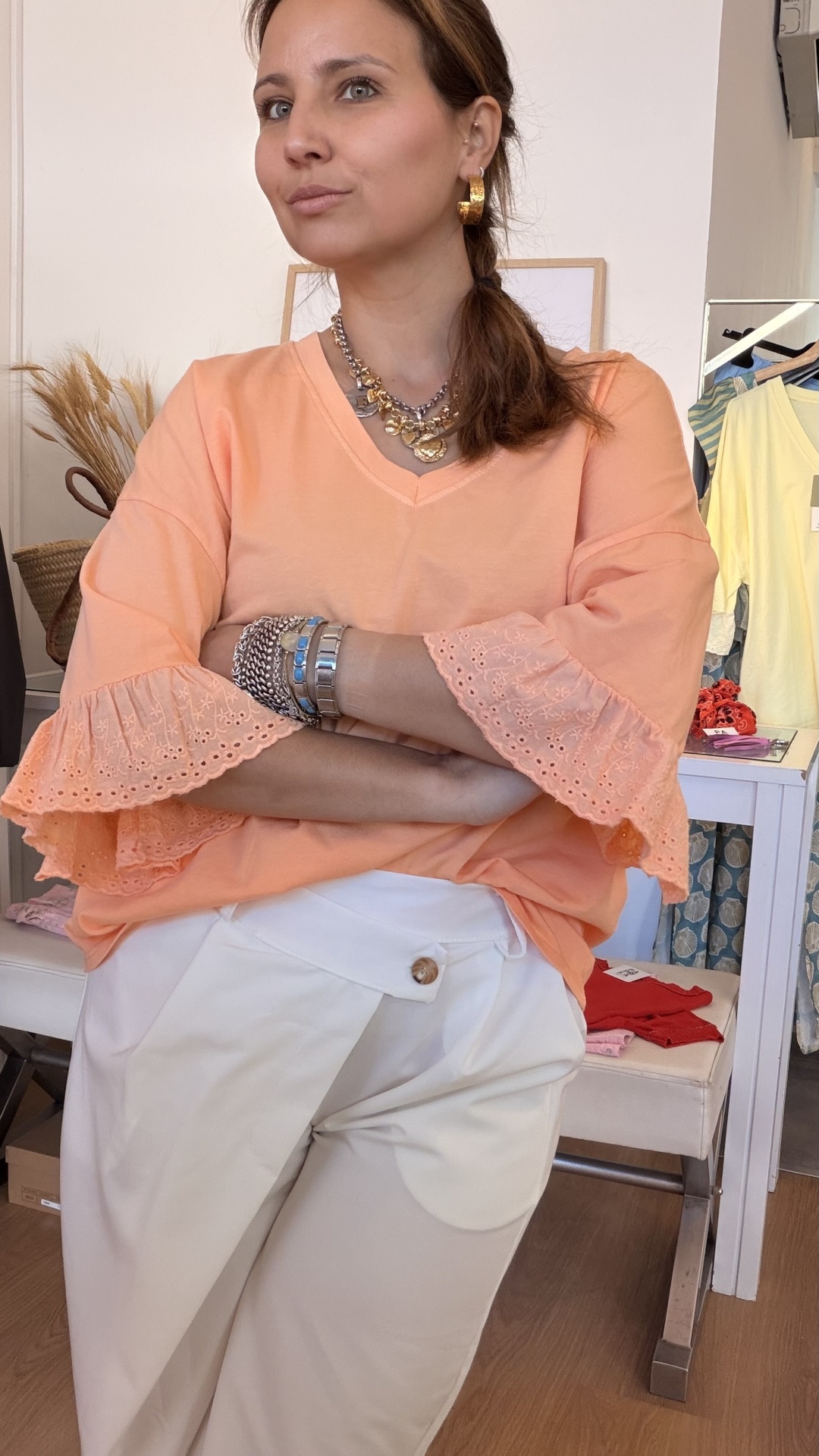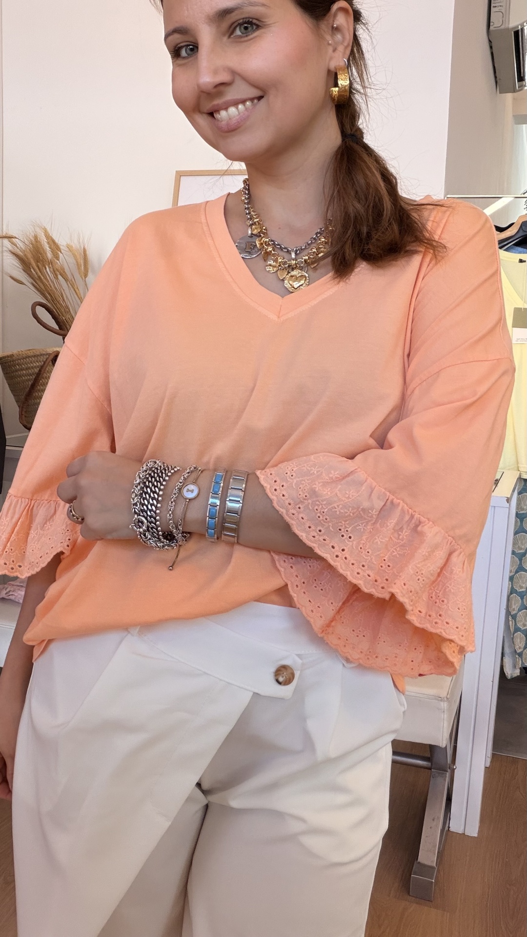Decote em bico, em algodão, com detalhe de bordado inglês.